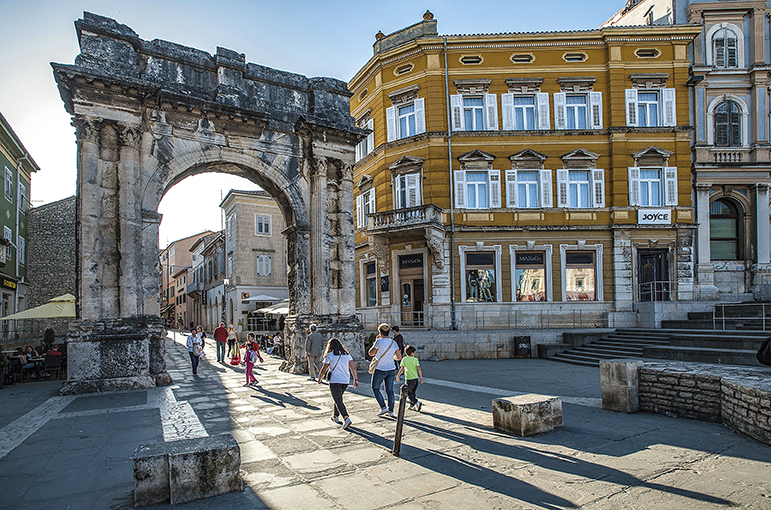 La base di partenza è Pola, antica città romana fondata intorno al 46 a.C., di cui sono giunti fino a noi splendidi monumenti. Primo fra tutti l’Arena, a due passi dall’ACI Marina Pula, un ottimo ormeggio per visitare il celebre anfiteatro costruito in candida pietra istriana tra il 2 e il 14 d.C. sotto l’imperatore Augusto e poi ampliato da Vespasiano, per rendere omaggio – si dice – a una sua amante del luogo. Ospitava fino a 23.000 spettatori che dagli spalti potevano assistere in prevalenza a combattimenti di gladiatori e naumachie, mentre sotto il campo di battaglia si trovava il deposito per le gabbie degli animali. Oggi invece l’Arena ospita manifestazioni culturali e concerti all’aperto e, nei sotterranei al posto dei leoni ci sono i pannelli della Mostra permanente sull’antica produzione istriana di olio d’oliva e vino. Sempre all’epoca risalgono l’Arco dei Sergi (o Porta Aurea), il Tempio di Augusto e il Foro Romano che impreziosiscono la città al pari degli eleganti palazzi eretti all’epoca della dominazione austro-ungarica cui si deve il rifiorire di Pola dopo il declino vissuto sotto la Serenissima.