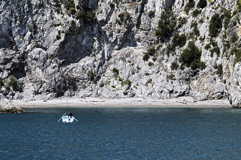 Dopo Positano la faccenda diviene delicata perché si entra nel territorio di Punta Campanella che è Area Marina Protetta (leggi limitazioni e divieti). La riserva inizia a Punta Germano, la prima che si incontra da Positano, quella caratterizzata da uno scoglio appena staccato dalla costa e continua fino a Grotta Matera, alla fine del golfo. Questa è contrassegnata come zona C, dove è vietata la pesca subacquea, la pesca sportiva e quella professionale non autorizzata, ma sono consentite la navigazione con imbarcazioni fino a 18 metri a una velocità non superiore ai 10 nodi, la balneazione, le immersioni guidate autorizzate, l’ancoraggio libero. Da Grotta Matera a scoglio Scuopolo, all’interno degli scogli Vetara (Zona A) e Li Galli (Zona B), è Zona B, dove sono vietate la navigazione privata con qualsiasi mezzo a motore, la pesca sportiva, le immersioni subacquee non autorizzate e l’ancoraggio libero. La costa antistante Marina del Cantone, in pratica da Conca del Sogno alla base della Punta di Montalto, è zona C. La costa ritorna zona B per tutto il capo di Punta Campanella compresa la baia di Marina di Ieranto fino a Cala Mitigliano. Da lì in poi la costa è protetta come zona C, a parte lo scoglio del Vervece che è integrale A. Anche lo scoglio Vetara è Zona A, mentre Li Galli è B. Insomma per avventurarsi in queste acque è consigliabile prima procurarsi una bella carta dei divieti preparata dall’Area Marina Protetta di Punta Campanella che ha base a Massa Lubrense.