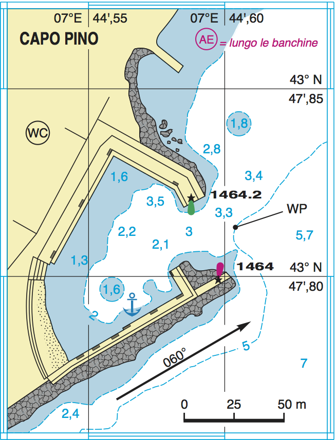 Porto di Capo Pino Porticciolo privato ad Est di Capo Nero. E’ dotato di banchine con anelli da ormeggio ed è un buon rifugio per piccole imbarcazioni.
