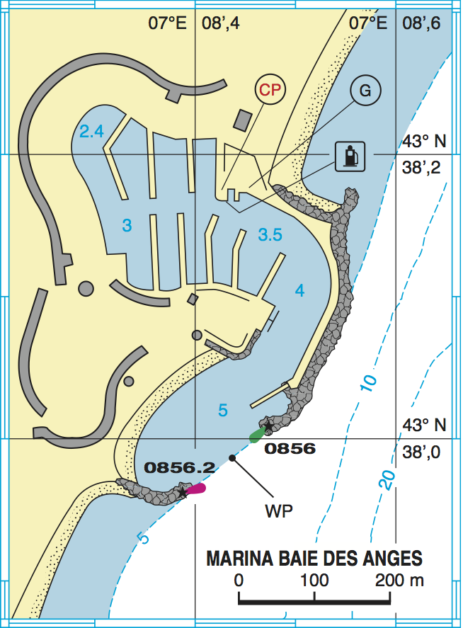 Marina Baie Des Anges approdo e ormeggio, servizi, attrezzature, waypoint, accesso, lunghezza massima, posti barca, traversia e meteo.