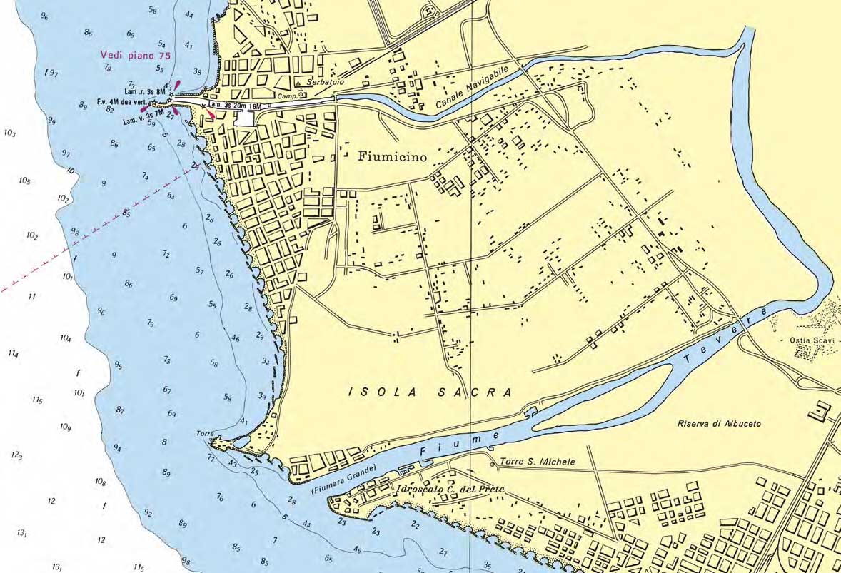 A nord del porto-canale si nota la torre di controllo dell’Aeroporto Intercontinentale Leonardo da Vinci. Vista dal largo, l’imboccatura non e facilmente distinguibile; notevole il traffico di pescherecci negli orari usuali del rientro (porre attenzione anche in caso di precedenza di diritto).