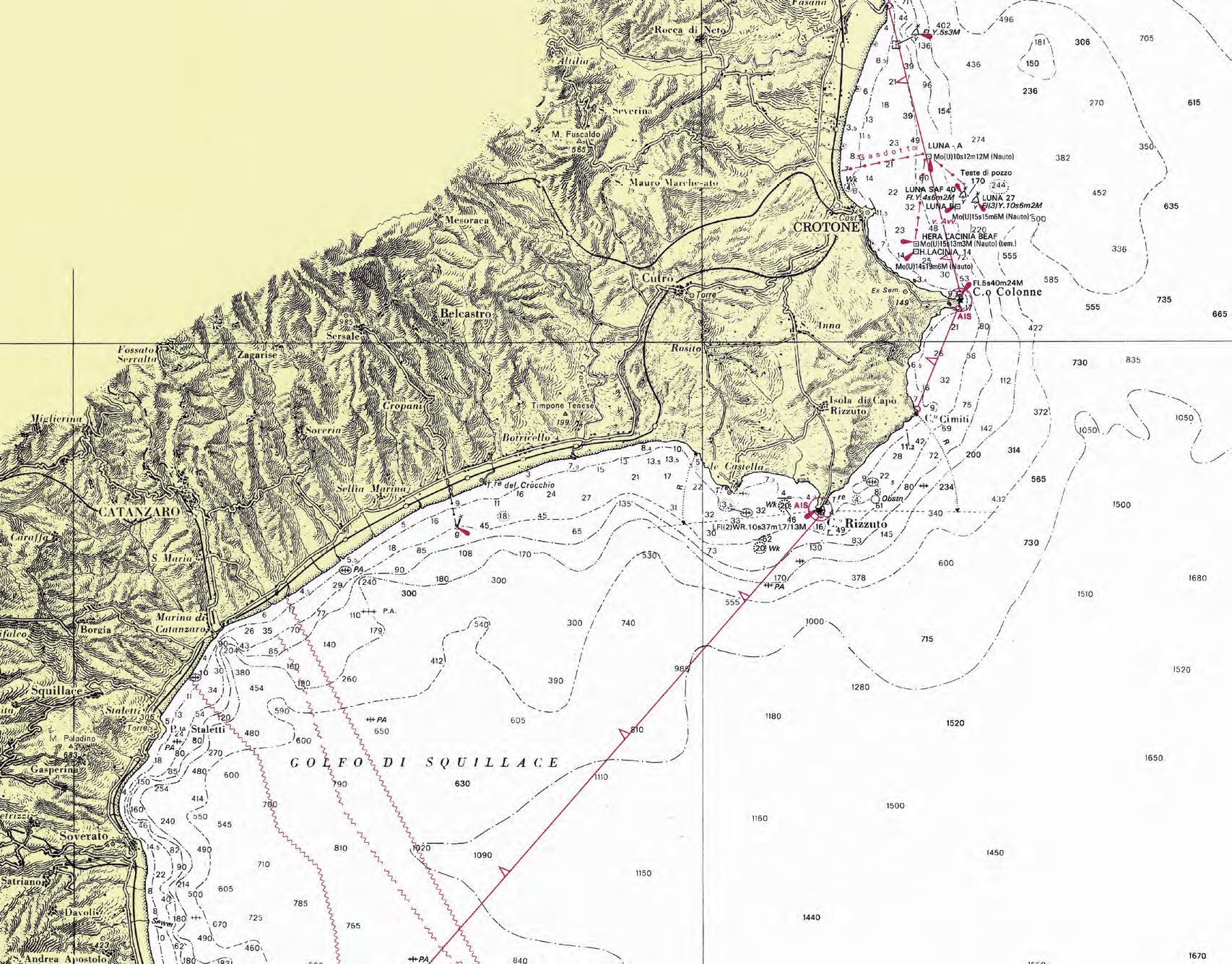 he al largo di Le Castella, a 900 m dalla costa, si trovano due secche con fondali di 3,5 m, mentre, sulla costa, si notano i resti di un castello e poco a destra un serbatoio. Capo Colonne si biforca in due bassi elementi rocciosi (quello a Sud è chiamato Punta Cicala) nel proseguimento del promontorio di Capo Rizzuto. Sul capo vi è il faro n. 3404, in una torre posta su di un edificio quadrangolare a due piani, il tutto bianco. Accanto, verso Sud, si nota un altro edificio. Come accennato, sotto il capo e per circa 200 m vi è una secca con 2 m di minimo. Verso NW, in direzione di Crotone e distante circa 1,2 M vi è il faro n. 3407, con nautofono su di una piattaforma, indicante il terminale di un metanodotto.