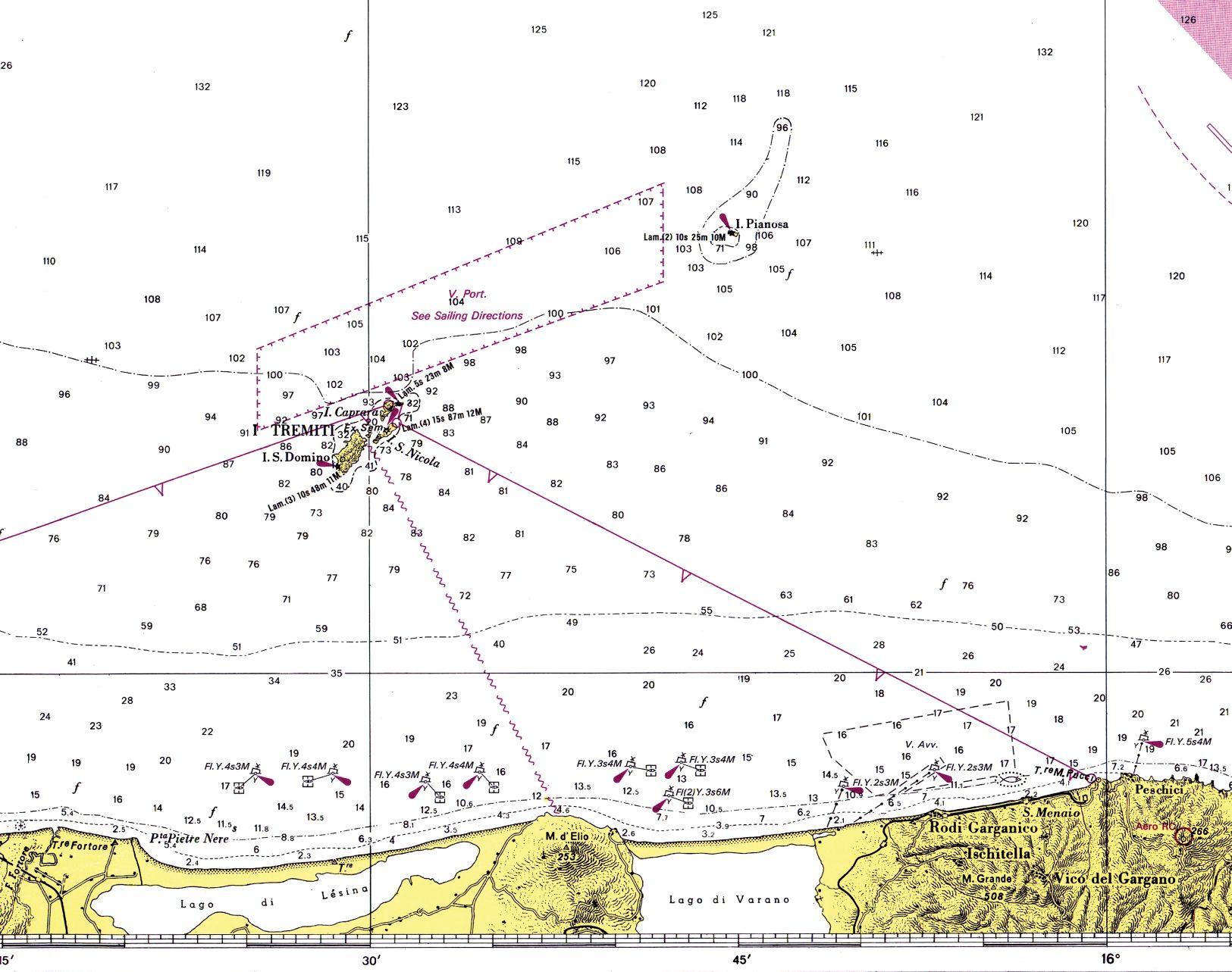 A nord dell’isola i fondali sono profondi, mentre a sud si segnala una secca. Sull’isola si trova una torre cilindrica bianca, con sopra il fanale n. 3832; alla torre è affiancata una bassa costruzione rettangolare. Anche le Isole Pelagose fanno parte delle Tremiti: l’Isola Pelagosa Grande, l’Isola Pelagosa Piccola e l’Isolotto Caiola, facenti parte della ex Jugoslavia. La prima è rocciosa e con le sponde ripide. Sulla sommità si trova una torre ottogonale, su costruzione con sopra il fanale n. 5423.